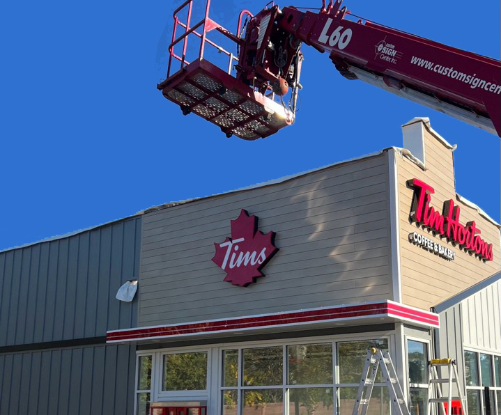 Depending on the size and placement, bucket trucks or cranes are used to safely position the sign.
